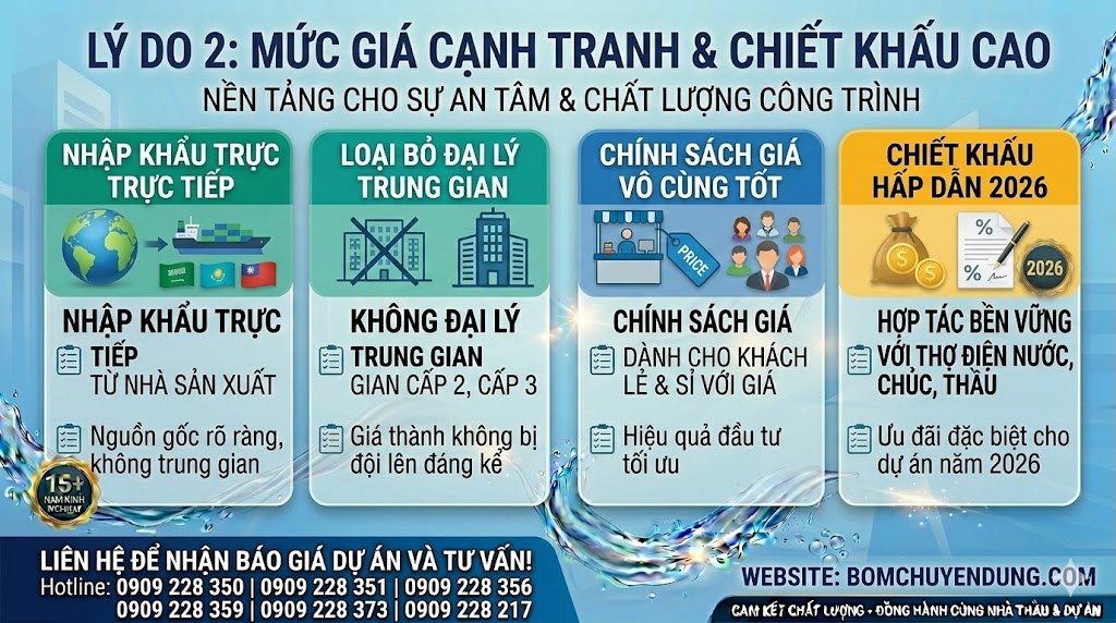 Các cửa hàng nhỏ thường phải nhập hàng qua nhiều khâu trung gian (đại lý cấp 2, cấp 3), dẫn đến giá thành bị đội lên đáng kể. Ngược lại, Máy bơm nước Siêu Phong nhập khẩu và phân phối trực tiếp từ nhà sản xuất. Nhờ lợi thế về quy mô, chúng tôi luôn có chính sách giá vô cùng tốt cho khách hàng lẻ, đồng thời cung cấp mức chiết khấu cực kỳ hấp dẫn cho các thợ điện nước và chủ thầu dự án trong năm 2026.