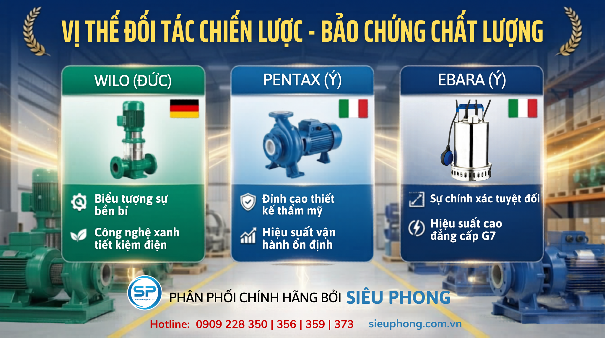 Trong thị trường máy bơm nước đầy biến động, việc tìm kiếm một đơn vị cung cấp không chỉ có sản phẩm tốt mà còn có vị thế pháp lý vững chắc là ưu tiên hàng đầu của các nhà thầu và chủ đầu tư. Siêu Phong Co. LTD tự hào khẳng định vị thế là đối tác chiến lược chính thức của ba “gã khổng lồ” ngành bơm thế giới: Wilo (Đức), Pentax (Ý) và Ebara (Nhật Bản) tại thị trường Việt Nam.